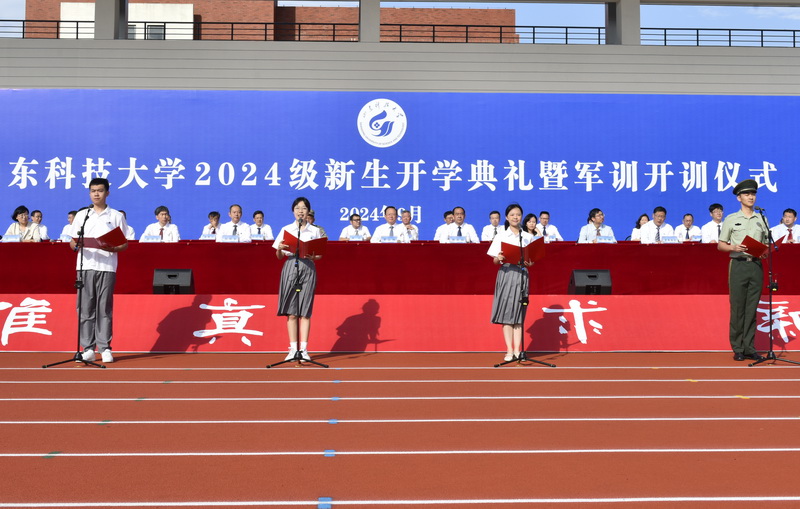 校领导罗公利、曾庆田、郭益灵、刘明永、徐方全、阳凡林、薛庆忠、诸葛福民出席典礼。典礼上,校党委书记罗公利向青岛校区军训旅及泰安校区、济南校区军训团授旗,校党委副书记、校长曾庆田讲话,校党委副书记郭益灵和副校长徐方全、诸葛福民分别宣读三校区军训决定和军训旅(团)领导成员名单。典礼由党委办公室(学校办公室)主任董桂刚主持。