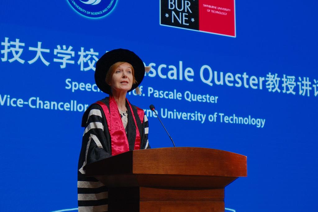 Pascale Quester代表斯威本科技大学为毕业生送上美好祝愿,激励他们在全球舞台上绽放光彩。她深情回顾了两校合作以来的点点滴滴,她指出,合作的每一步都凝聚着两校教育者对培养国际化人才的执着追求,期待双方继续携手共进,培育出更多兼具专业素养与全球视野的杰出人才,让合作办学的成果惠及更多学子。