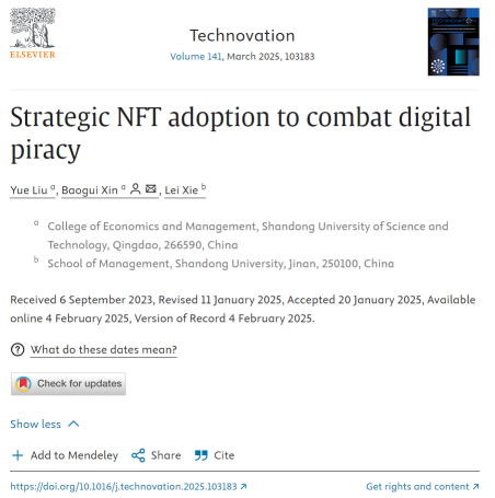 近日,日韩人妻无码一区二区三区久久99_日韩精品一区二区三区中文在线_无码日韩精品一区二区免费_久久久91精品国产一区二区三区_亚洲精品久久久一区黄无码_国产91精品一区二区麻豆网站_成人国内精品久久久久影院经济管理学院辛宝贵教授与在读博士生刘悦在《Technovation》发表题为“Strategic NFT adoption to combat digital piracy”的文章。